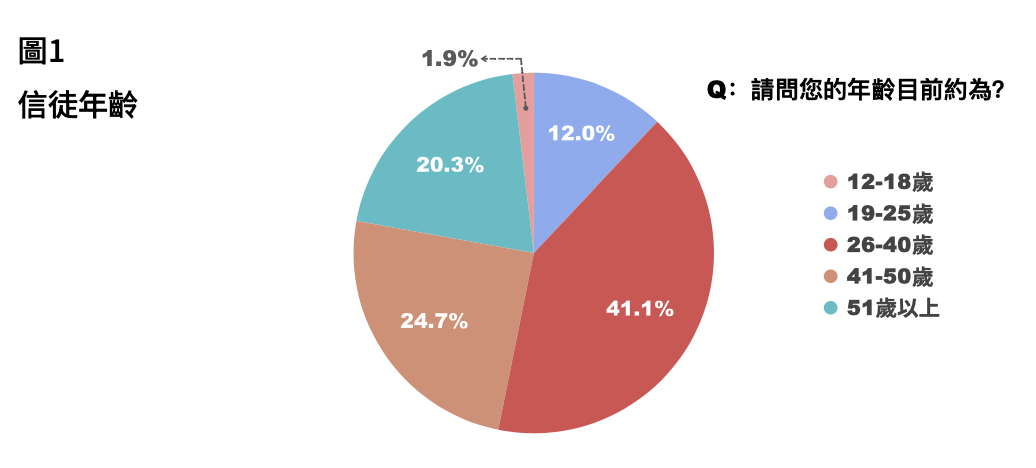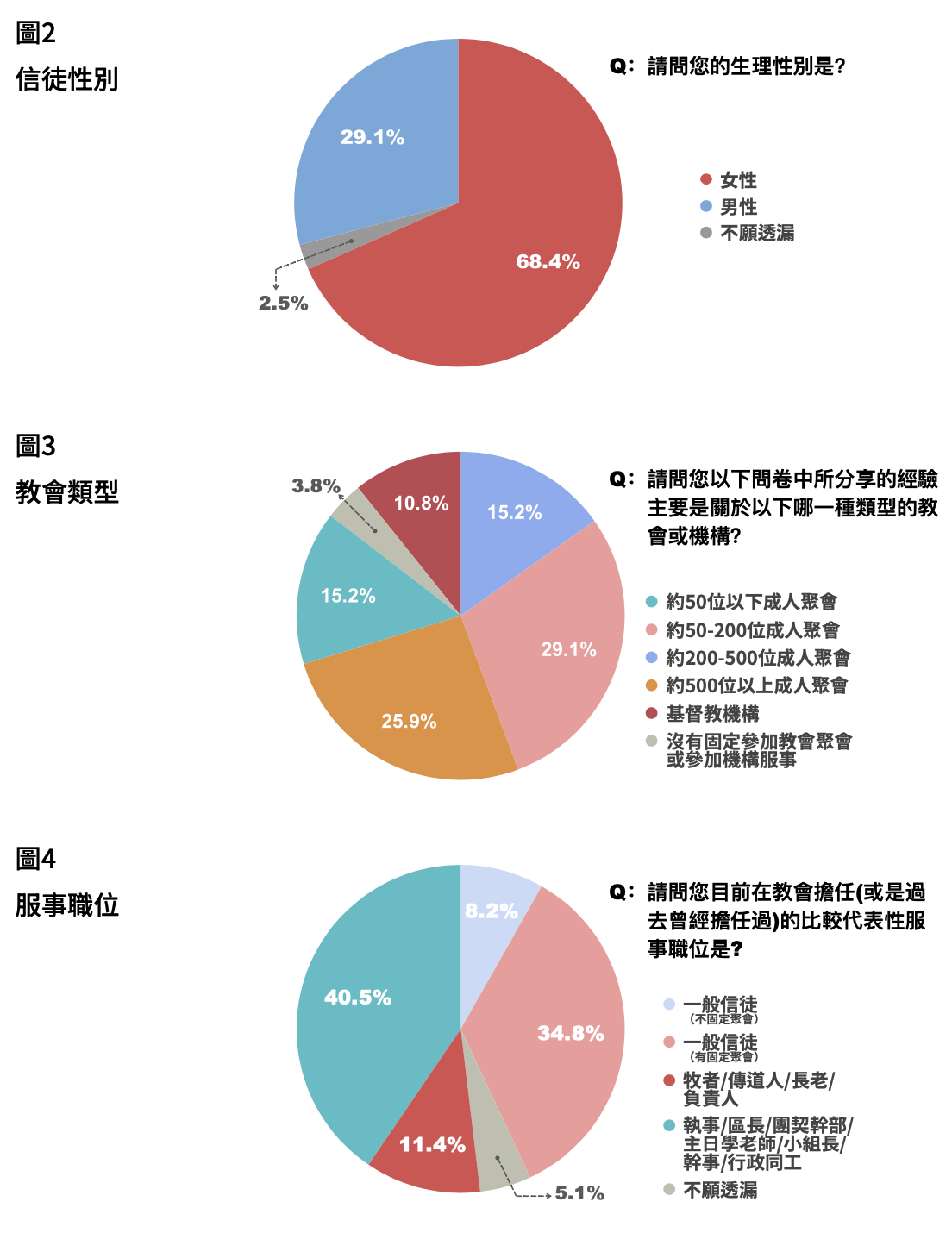 《不再沉默》是針對教會信徒的問卷,共有158筆資料。在年齡方面,26-40歲之間為最大宗,共65筆,其次是41-50歲者有39筆,51歲以上有32筆,19-25歲19筆,12-18歲僅有3筆。問卷填寫者有108位是生理女性,46位是生理男性,不願透露者有4位。在教會背景方面,當中有46筆分享的經驗主要來自「50-200位成人聚會的教會」,41筆是「500位以上成人聚會的教會」,「200-500位成人聚會的教會」與「有約50位以下成人聚會的教會」均為24筆,17筆來自「基督教機構」,6筆沒有相關資訊。而問卷填寫者過去擔任過比較代表性的服事職位中,64筆為「執事/區長/團契幹部/主日學老師/小組長/幹事/行政同工」,55筆為「有固定聚會的一般信徒」,18筆為「牧者/傳道人/長老/負責人」,13筆為「不固定聚會的一般信徒」,不願透露者有8筆。比例圖如下圖1到圖4: