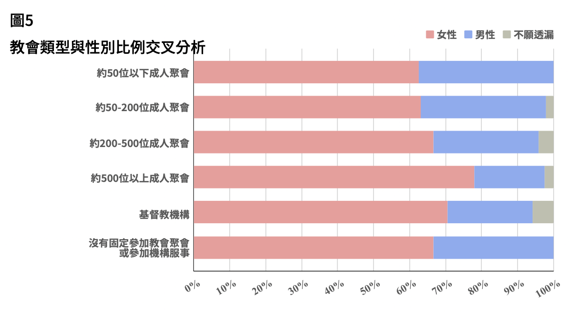 將「信徒性別」與「教會類型」、「服事職位」交叉分析如下圖5、6: