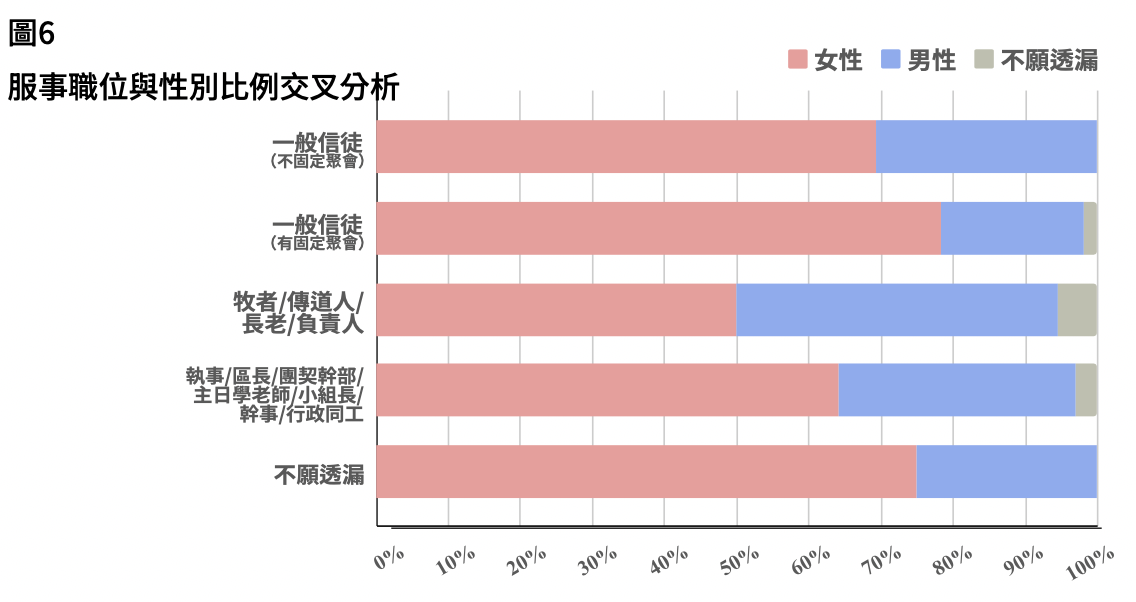 透過性別比例交叉分析,我們發現教會參與者雖然是女多於男,但男信徒在「執事、區長、團契幹部、主日學老師、小組長、幹事、行政同工」等中級同工的比例只略超過30%,但在「牧者、傳道人、長老、負責人」等一級主管比例卻接近50%,可約略看到「男領導、女附屬」的性別分工。本問卷呈現的教會性別圖像呼應長老教會歷年性別圖像19,教會傾向男性為主導的權力結構。