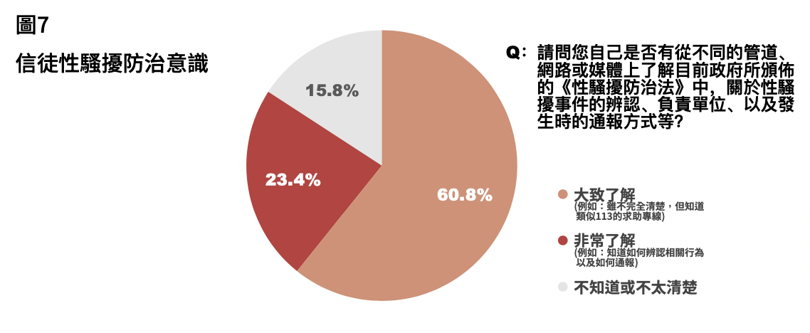 本研究以政府一般性的性騷擾防治宣導內容界定信徒是否有性騷擾防治意識,例如是否有從不同的管道、網路或媒體上了解目前政府所頒佈的《性騷擾防治法》、是否能辨認性騷擾事件、大致了解負責單位以及通報方式等。當中有96筆「大致了解」,37筆「非常了解」,25筆「不知道或不太清楚」。比例如下圖7: