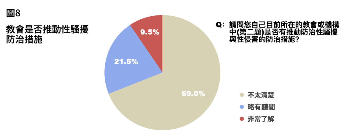 問卷詢問信徒目前所在教會或機構中是否有推動防治性騷擾與性侵害的措施,表達「不太清楚」有109筆,將近七成;「略有聽聞」34筆,「非常了解」有15筆。其比例見下圖8: