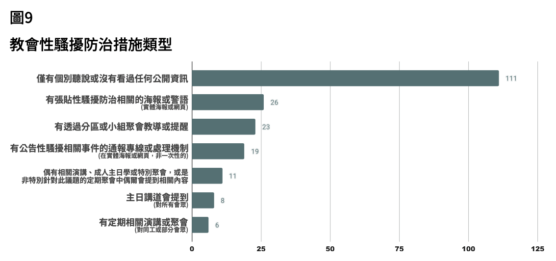 進一步詢問所在教會或機構主要採取哪些防治措施(複選),「僅有個別聽說或沒有看過任何公開資訊」有111次勾選,約三分之二,其次,「有張貼性騷擾防治相關的海報或警語(實體海報或網頁)」有26次勾選;「有透過分區或小組聚會教導或提醒」23次勾選;「有公告性騷擾相關事件的通報專線或處理機制(在實體海報或網頁,非一次性的)」有19次勾選;「偶有相關演講、成人主日學或特別聚會,或是非特別針對此議題的定期聚會中偶爾會提到相關內容」有11次勾選;「教會主日講道會提到(對所有會眾)」有8次勾選;「有定期相關演講或聚會(對同工或部分會眾)」有6次勾選。選項統計如圖9所示: