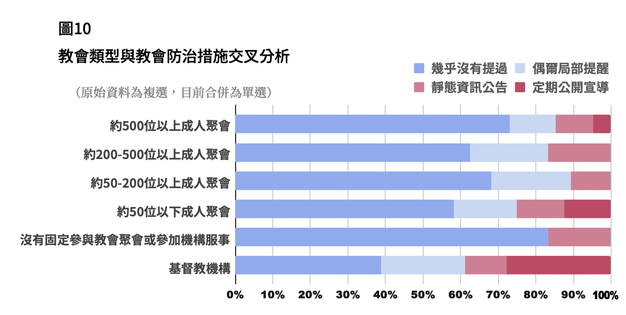 《不再沉默》158筆資料顯示,約三分之二的教會沒有或不清楚有沒有防治措施,在三分之一有防治措施的教會中,大多採用靜態資訊公告或偶爾局部提醒的方式,不到10筆資料顯示有定期訓練或在主日崇拜提及。觀察當中最常見的防治措施是「張貼海報」,可能的原因是「張貼海報」為政府施行多年的性騷擾防治措施,也可能這是教會相對比較容易完成的動作。另外,那一種類型的教會有採取更具積極性的宣導措施?如圖10顯示,很明顯最大比例為基督教機構(將近30%),其次是50人以下的教會,再其次是500人以上的教會,而中型教會(50-500人之間)則完全沒有公開宣導。為何「基督教機構」的防治措施積極性明顯更高?推測可能的原因是基督教學校、基金會等機構受到教育部、內政部的性平政策規範較多,監督也較嚴格,因而會有公開宣導等措施。而為何50人以下的教會相較人數規模更大的教會,其宣導措施更積極?有可能的原因是人數較少,以至於內部政策宣傳效果更好,而這部分我們沒有更多資料進行分析。