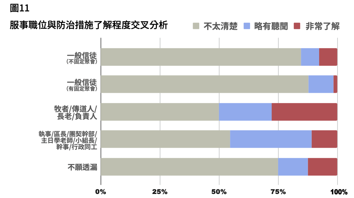先前圖8顯示有三分之二的信徒「不太清楚」所在教會機構是否有推動性騷擾與性侵害防治措施,然而,在教會中,怎樣的人會更了解教會防治措施?我們以問卷填寫者對防治措施的了解程度和「服事職位」、「教會類型」、「教會防治工作」做交叉分析,如下圖11、12、13: