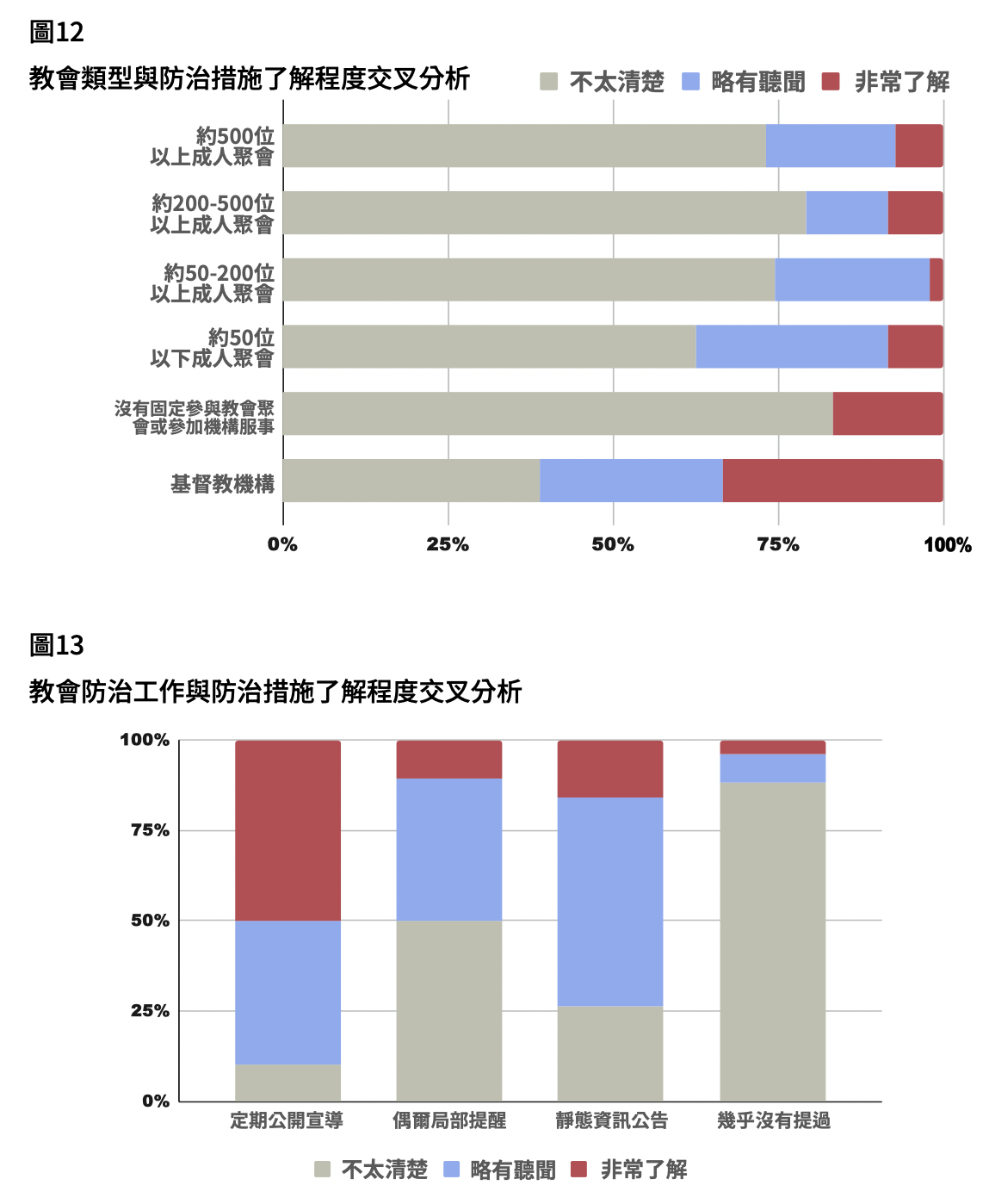 圖11顯示教會中最了解防治措施的職位是神職人員與教會領袖,其次是主日學老師等二級組織幹部,符合一般教會的組織架構安排,靠近決策圈的人會更了解教會政策,而「一般信徒」不了解的比例更大。圖12則顯示身處於「基督教機構」中的信徒對防治措施的了解程度明顯多於僅在堂會聚會者,呼應上個段落中圖10的內容結果,因為基督教機構受到性平規範較大,在內部有更多的宣導行動,於是內部成員對防治措施的了解程度越高;值得注意的是,「沒有固定聚會者」對防治措施了解程度也大於在不同人數規模的堂會聚會者,或許亦顯示堂會內的性騷擾防治意識遠低於社會。最後,圖13顯示,將「教會的防治工作」與「信徒對性騷擾防治的了解程度」交叉分析後,明顯看出只有定期公開宣導的方式才能讓信徒較為了解教會或機構的防治措施,如果只有偶爾局部的提醒或靜態的資訊公告,並不會增加信徒了解的程度。