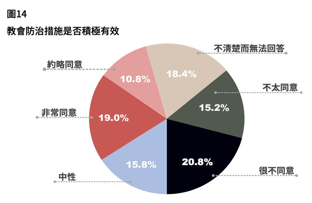 詢問信徒是否同意教會或機構對性騷擾與性侵害的推動是積極有效,表達「很不同意」有33筆,「非常同意」有30筆,「不清楚而無法回答」29筆,「中性」25筆,「不太同意」24筆,約略同意17筆。其比例如下圖14: