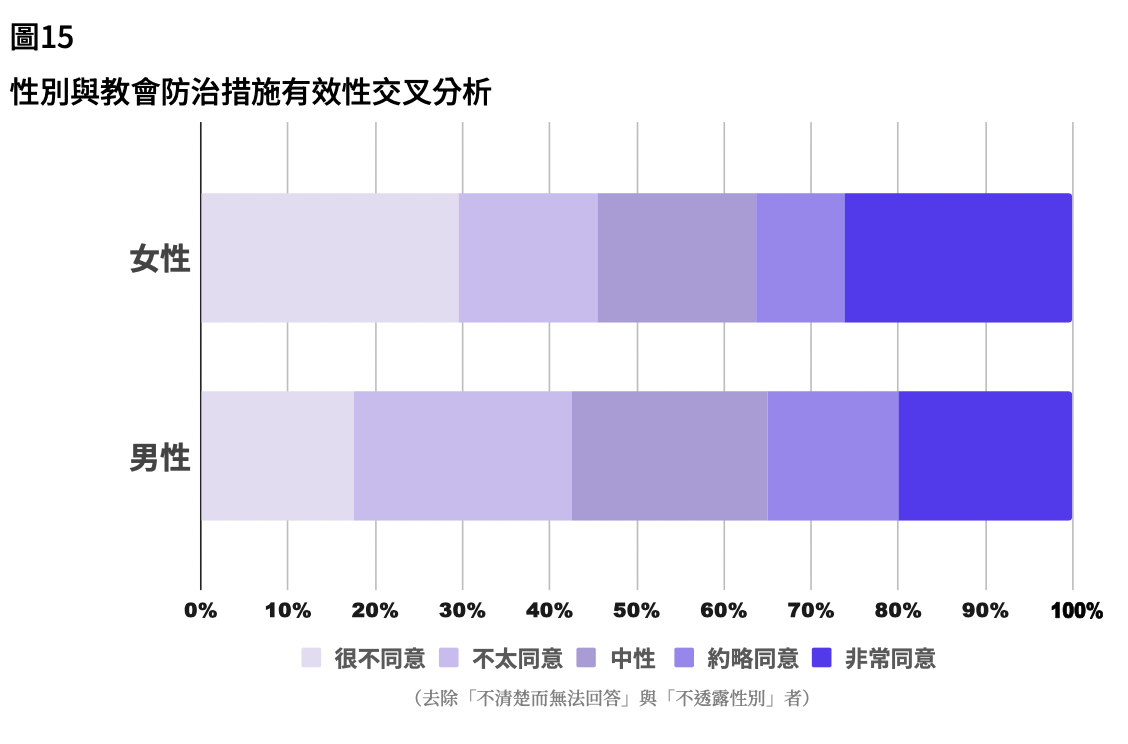 從圖15來看,女信徒對於教會防治工作有效性的回覆呈現兩極化結果:「很不同意」與「非常同意」皆超過四分之一,但整體而言不同意仍偏多(約45%)。男信徒則是「很不同意」與「非常同意」都明顯偏少,中性選項較多;從中可見性別間的差異:女性對於教會防治工作有效性比男信徒呈現更明確的想法,且態度較偏向不同意,而男性對於此一議題採取中性態度更多,看不太出來對此議題的想法。圖16則顯示牧者等堂會領袖階級傾向同意防治有效性者達到70%,然而,中級同工與一般信徒(固定聚會者)傾向同意的比例低於30%,傾向不同意的卻有近50%,顯示管理階層的認知與一般信徒間似乎有著相當大的差距。