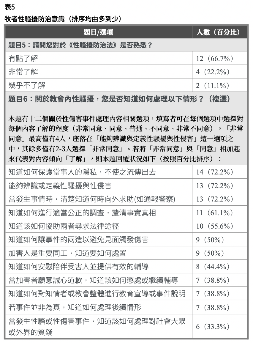 在《儆醒為主》問卷中,填答的牧者曾聽聞性騷擾20個案共14件。其聽聞事件樣態中(複選),有8筆「完全沒有」,8筆「非肢體性騷擾」,2筆「肢體性騷擾」,1筆「猥褻」,1筆「強制或乘機性交」,1筆「權勢性騷擾」,1筆「其他」,顯示有一半的牧者都聽聞過教會內性騷擾事件,且性騷擾樣態包含不同類型,代表牧者非常有機會需要處理到教會內的性騷擾事件。本研究以一般政府推動性騷擾防治的內容作為信徒性騷擾防治意識的指標,牧者是教會內發生性騷擾事件中,第一線處理的角色,本研究對於牧者的性騷擾防治意識自評指標則增加「遇到相關事件是否知道如何處理」的選項。牧者的性騷擾防治意識資料如下表5: