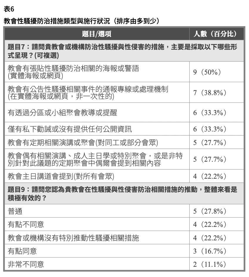 牧者所在教會的性騷擾防治措施與施行狀況如下表6: