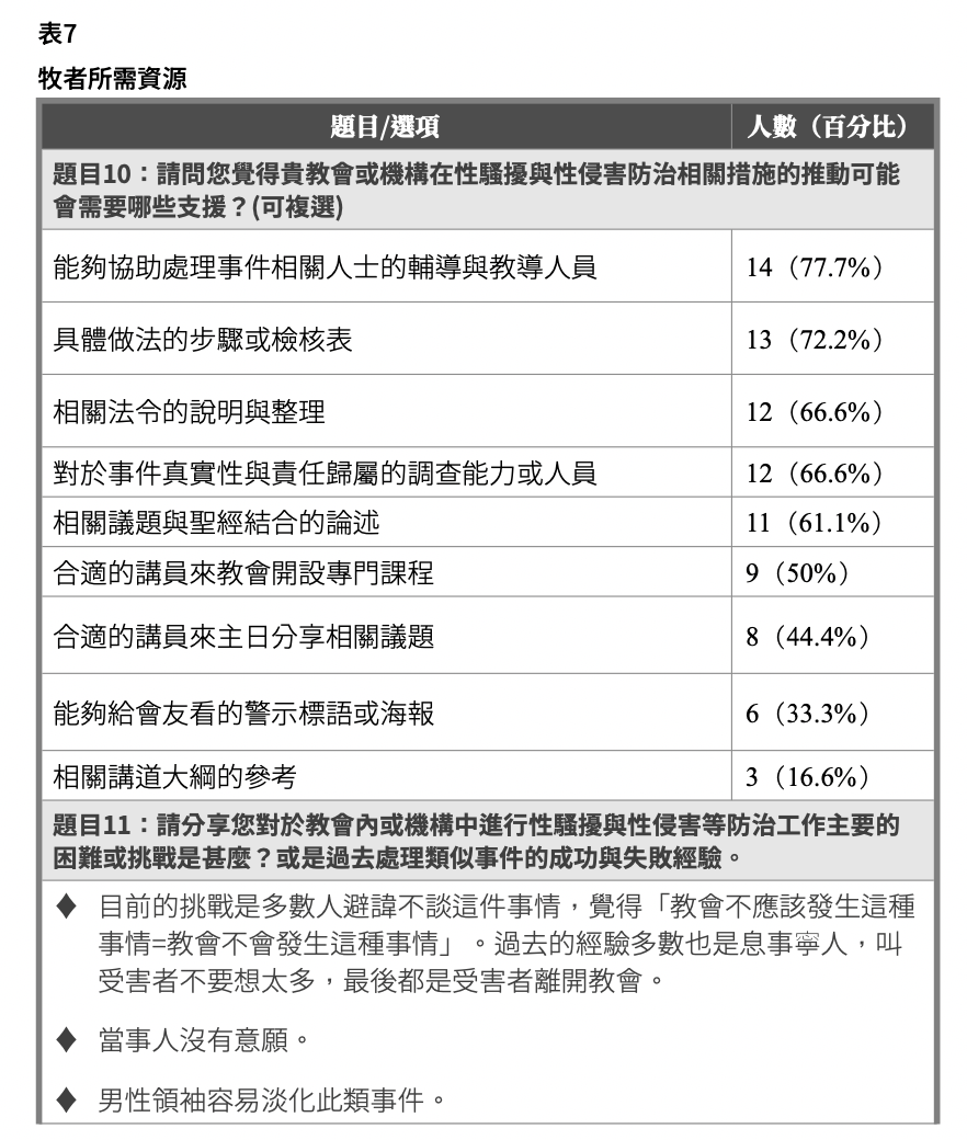 牧者在性騷擾防治知能方面所需資源與相關意見如下表7:
