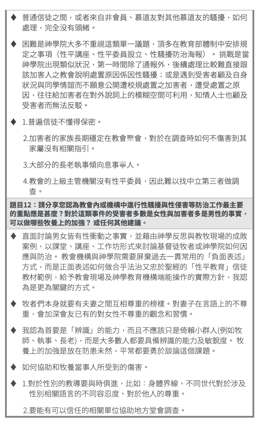 以「個人─組織─社會文化」的框架整理牧者認為當前教會性騷擾防治所需的資源與面對的挑戰。在個人層面:需要有領袖榜樣、牧養陪伴能力、專業人員、教會參與者的辨識能力;困難則是當事人缺乏求助意願、信徒缺乏保密認知、男性領袖傾向淡化事件。組織層面:需要制度化流程、具體做法、專門課程與教材、第三方單位等;困難則是沒有相關單位、制度淪為形式。在文化方面:性騷擾防治的阻力是要面對內部家庭勢力、人情包袱、缺乏性別教育素養與息事寧人的文化。