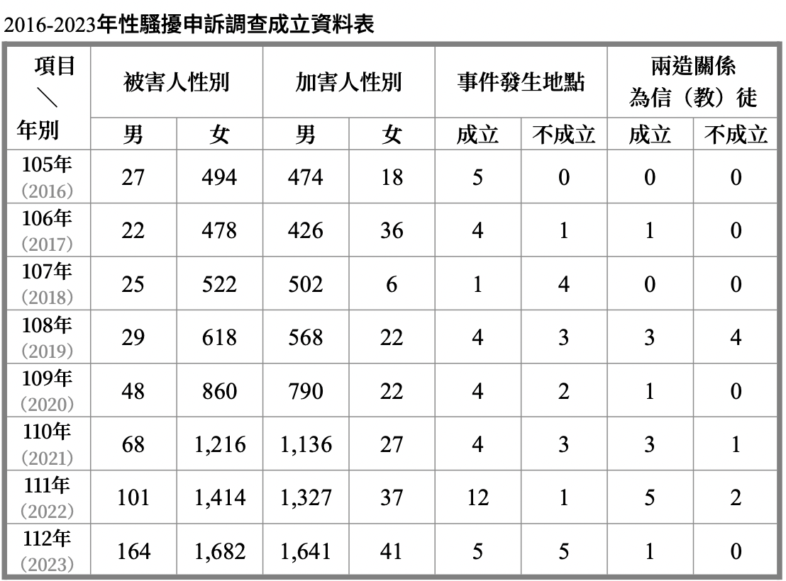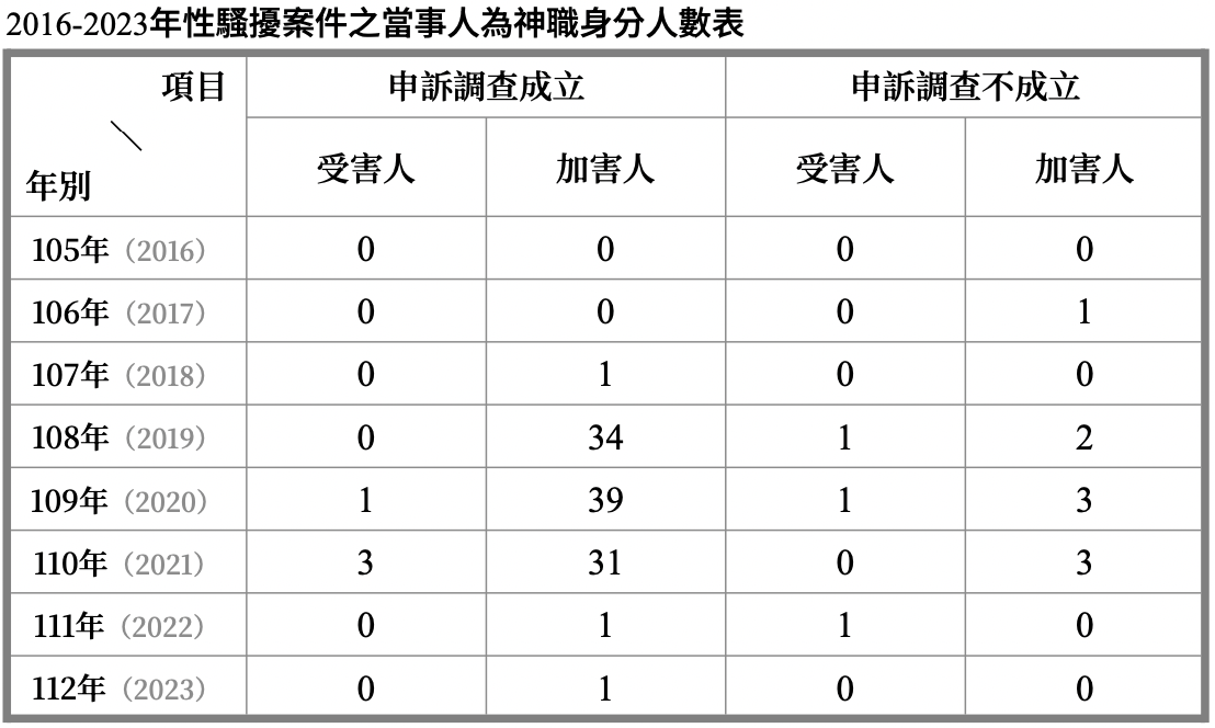 我們偶爾會在媒體看到一些利用宗教之名騙財騙色的新聞,但目前並沒有專門項目的統計數字。在衛生福利部(下稱衛福部)的性侵害統計資料中,「通報單位」的項目包括警政、教育、醫院等十三種分類;在受害人與加害者「兩造關係」中,有家人、朋友、上司下屬等十八種關係;並有十二種主要發生場域的案件件數統計,但是在這些分類之中,並不包括宗教類別,從統計表格看不出來宗教場所的現況,宗教場所中的性侵犯罪仍是黑數。然而,在性騷擾案件統計中,事件發生地點就有「宗教」的項目,在「兩造關係」和「職業身分」也有加入「神職人員」、「信(教)徒」的統計,雖然無法細分宗教類別,但可以看到宗教場所的確存在性騷擾案件,如下表1、2: